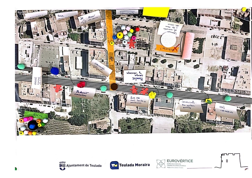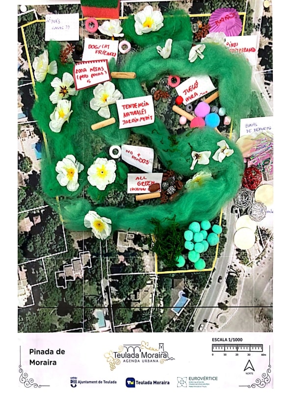 En esta dinámica se buscaba tratar temas importantes del municipio de una forma diferente a través de una maqueta a escala. Por un lado, se habló de la Avenida Mediterráneo, que atraviesa el núcleo de Teulada, con el objetivo de abordar el futuro uso de esa calle. En Moraira, se decidió tratar el nuevo parque que se va a crear en el sector UBA-10 como nuevo espacio verde cercano a la playa. Se comenzó la sesión con una puesta en contexto del avance de los trabajos de agenda, para a continuación comenzar a debatir las zonas sobre las que se iba a trabajar. Para materializar las ideas se puso a disposición de los participantes todo tipo de material para maquetas para abordar la problemática desde un punto creativo.